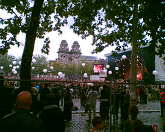 Samen met enkele vrienden zakten we af naar de kaaien. Parkeren op Linkeroever om zo de voetgangerstunnel te gebruiken om bij het festivalsplein te geraken, bleek een goed idee te zijn. Want zo zag het Zuid er voor 1 dag uit: een festivalplein. Trouwe festivalgangers herkenden misschien vele standjes en zelfs infrastructuur vanop een of andere wei die ze hebben aangedaan afgelopen seizoen. Muziek, zon, regen (met bakken), het was weer even zomer. Er was geen morgen, enkel vandaag, en overal lachende gezichten. Toen de tijdelijke wolkbreuk plaats vond zocht iedereen met een glimlach een plaats om even te schuilen. Ja, zelfs via open ramen werden baby’s doorgegeven in café’s waar enkele tafels graag aaneen werden geschoven om zo een tijdelijk kinderopvang te installeren. Maar u bleef. Tijdens het optreden van Douzi bleek dat de organisatoren de acties van Asfaltkonijn hadden opgemerkt want tientallen grote, witte balonnen werden het publiek ingesmeten om zo een dansende ballonnenzee te laten ontstaan.